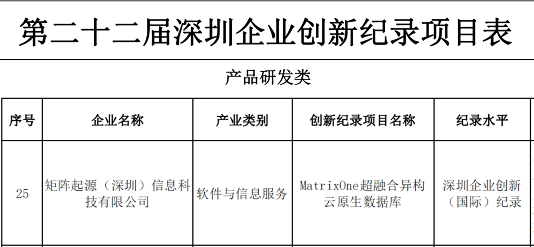 近期,第二十二届“深圳企业创新纪录”结果已经公示,矩阵起源凭借 MatrixOne 新一代超融合云原生异构数据库产品,荣获"深圳企业创新(国际)纪录"殊荣! 该奖项由深圳市企业创新纪录组织委员会主办,于2023年3月组织开展第二十二届“深圳企业创新纪录”审定发布活动。经过数月的审查、专家尽调及评审,最终共审定通过209个项目为第二十二届“深圳企业创新纪录”,其中“创新(国际)记录”审定结果仅10个名额,矩阵起源位列其中之一! 除颁发牌匾和证书外,矩阵起源也将入编《深圳年鉴》和《深圳企业创新纪录2023年鉴》,作为深圳优质创新成果展示。矩阵起源获得该荣誉,证明了其强大的自主创新实力和技术水平,更肯定了其核心产品 MatrixOne 在数据库领域的引领地位。这一成就不仅进一步激励着矩阵起源持续为用户带来更高性能、更具性价比、更优体验的数据库产品,同时也鼓励着MatrixOne 产品持续进行创新,为行业发展树立更高标杆。 为深入贯彻党的二十大关于“必须坚持科技是第一生产力、人才是第一资源、创新是第一动力”、“加快实现高水平科技自立自强”的发展战略,在新发展阶段推动企业高质量发展,深圳市企业创新纪录组织委员会于2023年3月组织开展第二十二届“深圳企业创新纪录”审定发布活动,并于11月23日召开审定会议并完成审定。 深圳企业创新纪录审定发布活动是由深圳工业总会联合相关政府部门、行业协会、研究机构、媒体机构共同开展的一项旨在推动深圳企业广泛开展自主创新、提升生产力水平的重要公益性活动。自2002年启动以来,迄今已持续开展二十一年,前21届共审定发布1673家企业3258项“深圳企业创新纪录”,涵盖了50多个行业。该活动已经成为全市企业自主创新的演兵场、展示创新成果的大舞台,为深圳市建设现代化国际化创新型城市做出了积极贡献。