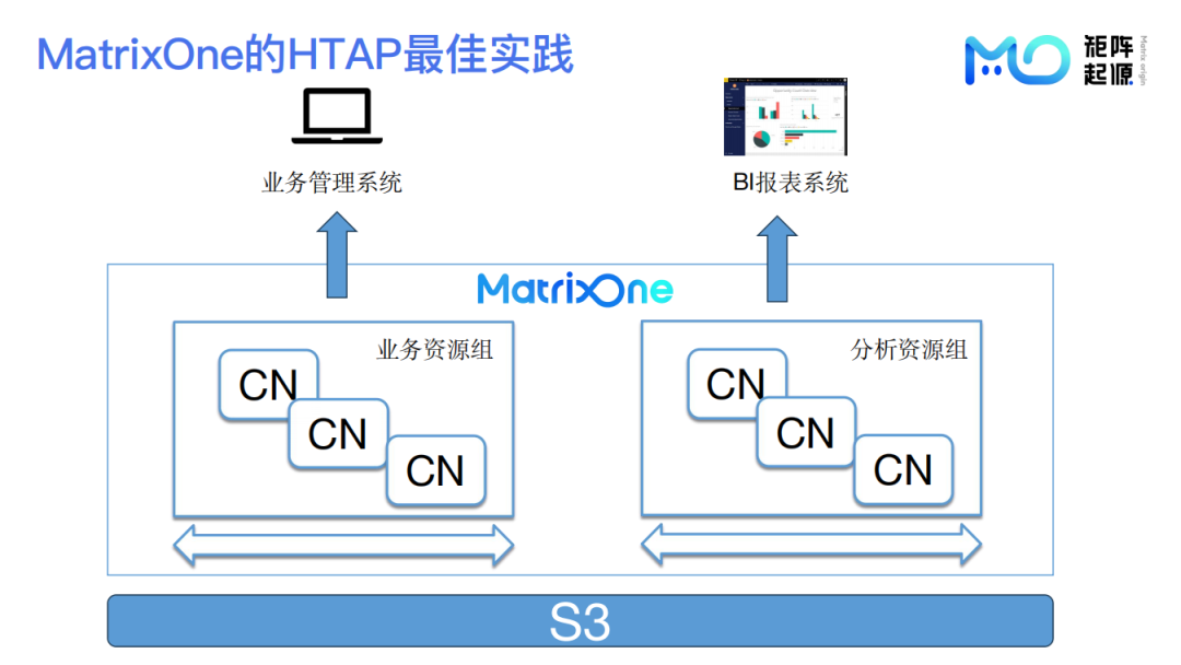 我们可以将业务系统和 BI 系统整合在同一个 MatrixOne 集群中,通过资源组实现隔离和扩容策略。当业务负载达到一定程度时,系统可以自动进行扩容。数据仍然存储在 S3 中,实现了数据的融合。同时,通过MatrixOne 的分析能力,可以为不同业务分配专门的资源组,实现负载分离。这种解决方案既满足了数据融合的需求,又实现了业务之间的隔离。