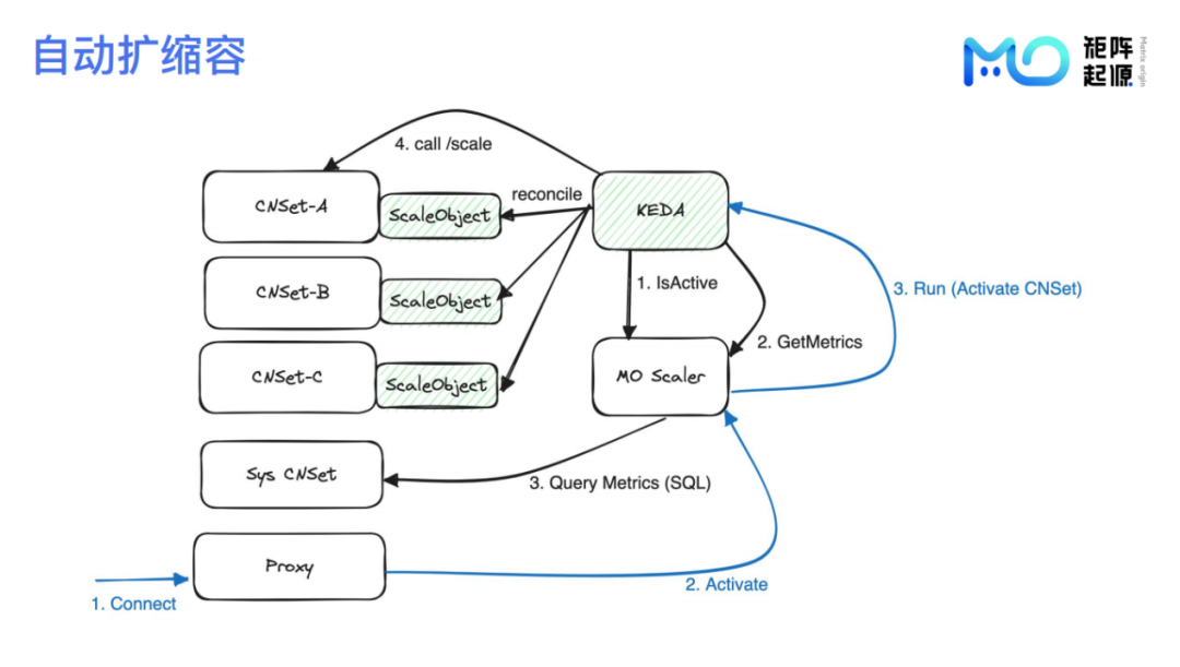 在云端,提供了自动扩缩容的能力,这是 Serverless 基础架构的基础。通过云原生相关的开源组件,如 KEDA,可以感知整个集群的负载。MatrixOne 具有一个独特之处,即会将集群的相关负载记录在 MatrixOne 内部。当集群或 CN(节点)的资源达到预设上限时,会触发扩容机制。这意味着,在达到特定阈值后,系统会自动调用 K8S 接口,增加 CN Set 的节点。由于这个过程实际上是调用 K8S 接口进行扩容,因此实现起来相当便捷。