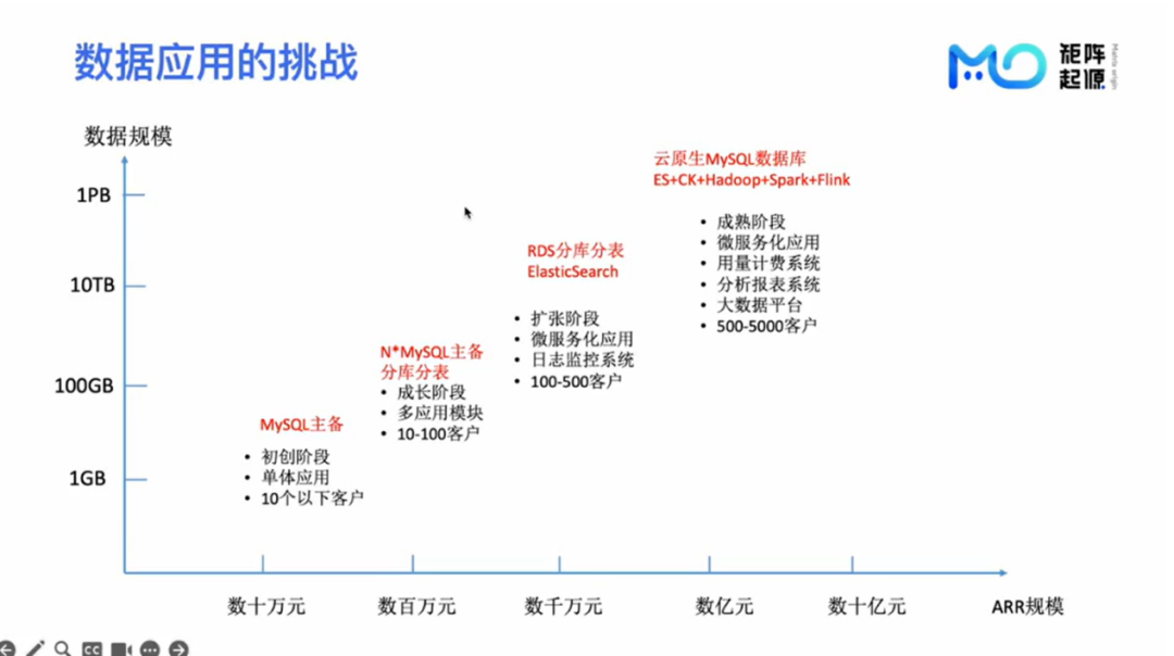 在当前大数据时代或 ABC 时代(人工智能、大数据、云计算),数据应用面临诸多挑战。其中一个关键问题是扩展性,数据的量和应用场景随着企业或应用的发展不断增长,需要保证在增长过程中数据应用能够具备相应的拓展能力。例如,一家公司从年收入零开始,逐渐发展到数十万、数百万、数千万甚至数亿级别。在这个过程中,数据量和应用需求也随之增长,这意味着数据架构必须随着时间推移和数据质量的变化不断调整。