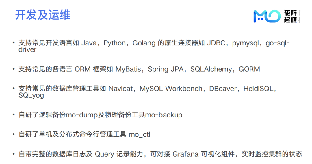 在开发和运维工具方面,MatrixOne与MySQL高度兼容。针对使用 MySQL 开发应用程序,我们已经验证了主流框架和多种语言的兼容性,其中包括 Java、Python 和 Golang。尽管我们尚未完全适配其他语言,如 C# 或 Ruby on Rails,但简单试用后,预计其匹配度也相对较高。因为 MatrixOne 本质上与 MySQL 兼容性良好,所以在使用这些语言时,大多能无缝切换。