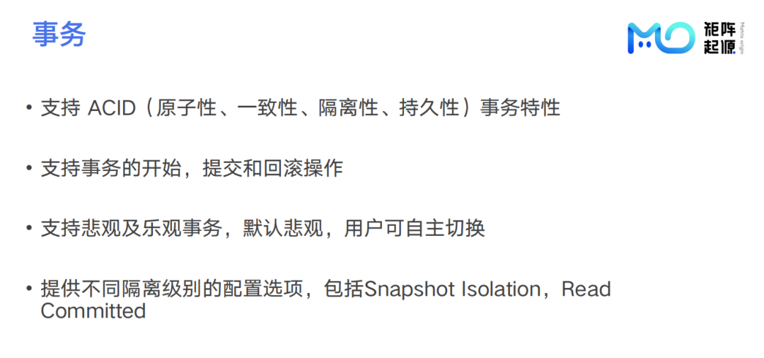 目前,默认使用悲观事务以及 RC(Read Committed)隔离级别。当然,用户可以根据需求切换到乐观事务以及 Snapshot isolation 等相关隔离级别。然而,在主流的行业应用中,悲观事务依然占据主导地位,主要是因为它便于应用程序的开发和维护。