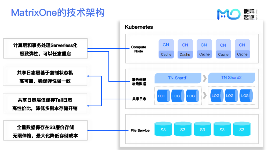 MatrixOne 是一款全新设计的数据库,致力于满足现代云原生环境的需求。它采用了几个关键技术架构,其中之一是存算与事务分离。这一架构将存储,计算和事务三大功能拆分开来,以实现更高的灵活性和性能。