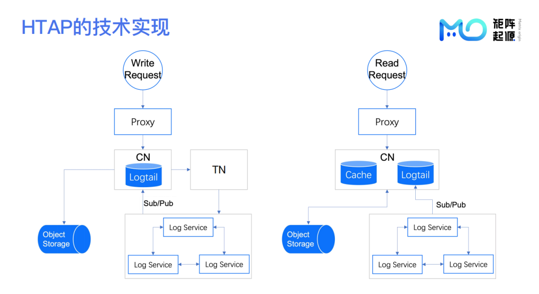 MatrixOne的HTAP实现细节与行业中的主流做法也有差异。目前,行业中存在两种 HTAP 技术路线:一种是使用两个引擎,分别处理 TP 和 AP,将两个处理引擎合成为一个数据库;另一种是我们所采用的路线,即在一个引擎内通过区分不同链路来实现 HTAP。