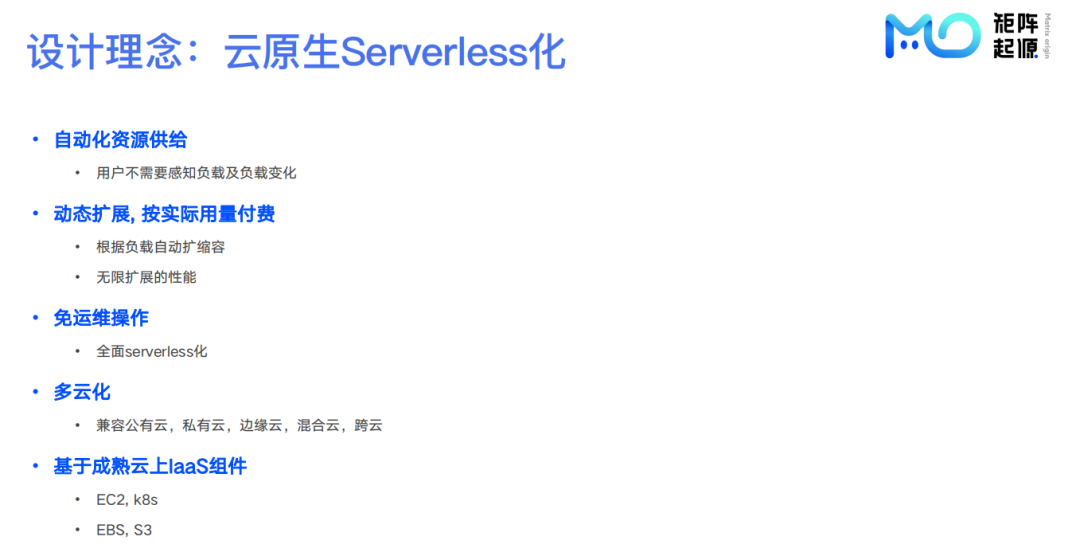 MatrixOne的另外一个理念就是云原生与Serverless,虽然在应用层开发者应用K8s等云原生技术已经相对普遍。但在数据层或数据库层,云原生化的程度仍有待提高。为实现真正的云原生数据应用,我们需将数据库完全容器化,使其具备自动化和弹性扩展的特点。为此,我们设计了 MatrixOne Cloud,将其 Serverless 化,使其与应用层一样具备完全自动扩展的能力。