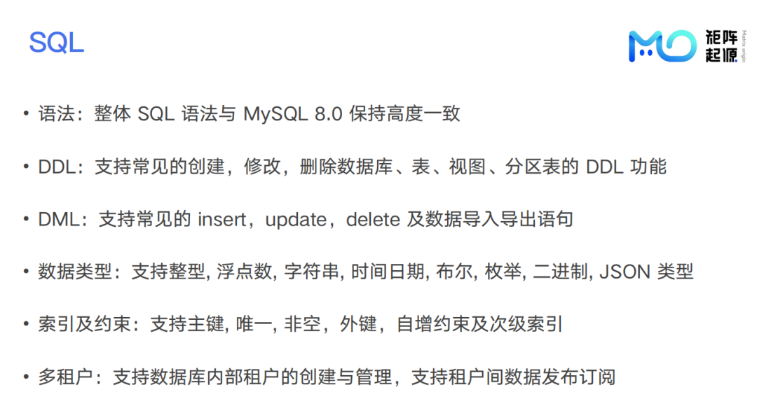 MatrixOne 今年发布了1.0 版本。整体实现了与 MySQL 8.0 高度一致的 SQL 语法,使得原有 MySQL 应用的迁移工作非常轻松便捷。其中包括 DDL(数据定义语言)和 DML(数据操作语言)等基本功能,涵盖了大部分常用数据类型。