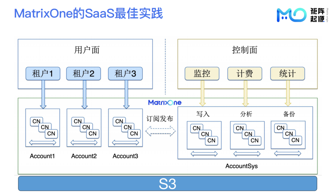 控制面涉及监控、日志、计费和统计等功能,传统应用中通常通过单独的数据库或大数据组件来满足这些需求。MatrixOne 可以将这些功能集成到一个集群内,通过不同资源组的形式来实现各种负载的分割。同时通过订阅发布机制,可以控制面与用户面可以进行高效数据交互,实现数据共享。