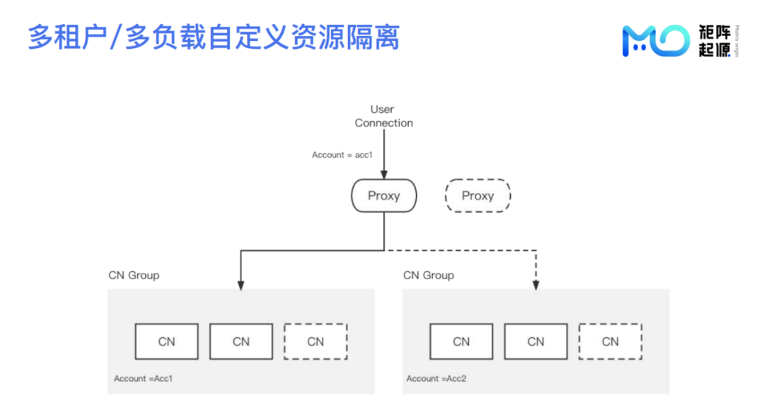 接下来介绍多租户和多负载自定义资源隔离相关的能力。MatrixOne自带多租户能力,意味着可以在数据库中创建不同的租户,互相使用用不同的数据空间。不同的租户还绑定不同的计算资源组,也就是一个或者若干个CN,这完全基于 Kubernetes 中容器之间固有的隔离性。我们可以通过Proxy服务中的标签形式来定义不同的 CN 组。这些组可以绑定在租户上,也可以进一步根据业务需求进行划分。