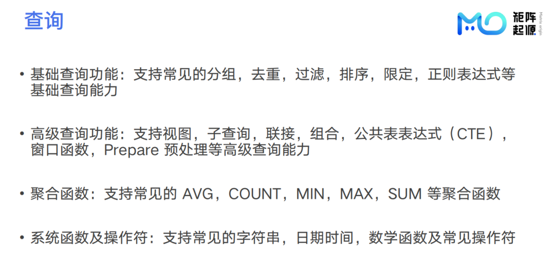 在查询方面,1.0 版本已经涵盖了主流的基础查询和高级查询功能,满足基本的业务应用和数仓中的应用需求。其中包括窗口函数、CTE(公共表表达式)以及递归 CTE 等高级查询能力。此外,常用的聚合函数和系统函数也一应俱全。