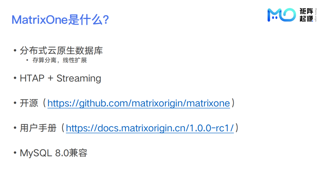 MatrixOne 是一个开源项目,欢迎大家浏览上图中列出的开源地址,以及用户手册,以便深入了解技术细节和使用说明。MatrixOne 在设计时,以国内最大的开发者社群 MySQL 8.0 为主要兼容对象,因此用户在迁移过程中可以轻松上手,几乎无需重新学习使用方式。