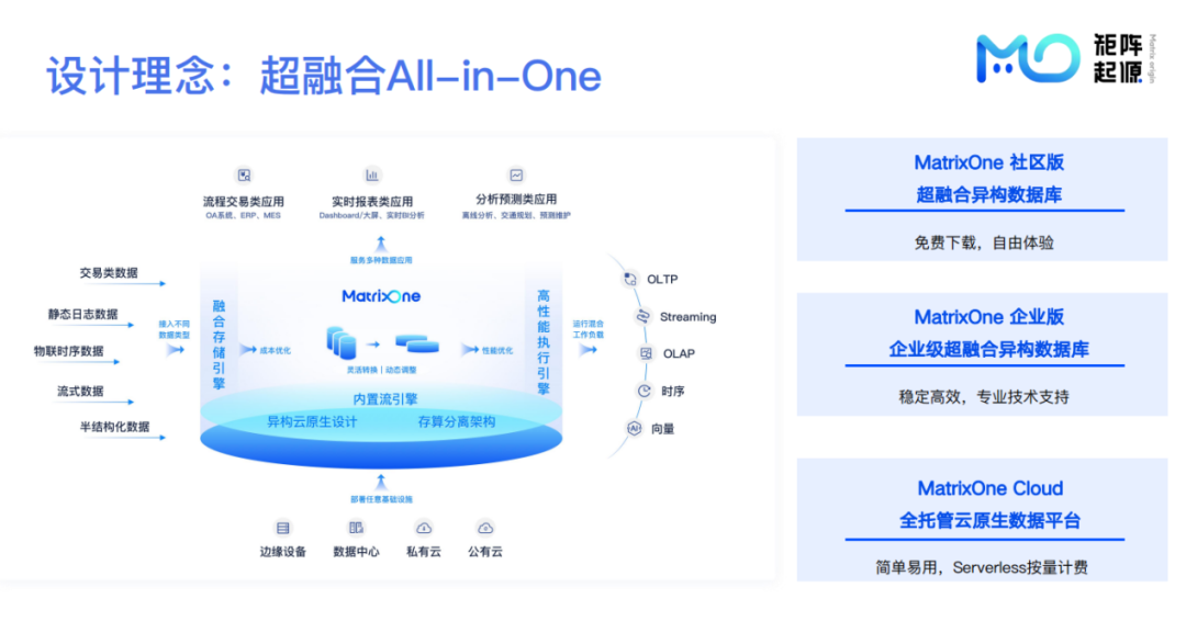 MatrixOne 通过完全重构底层数据引擎,基于先进架构设计出一款超融合的全功能数据库。这意味着企业只需使用一款数据库就能解决各类应用场景的问题,包括流程交易、实时报表和分析预测等。