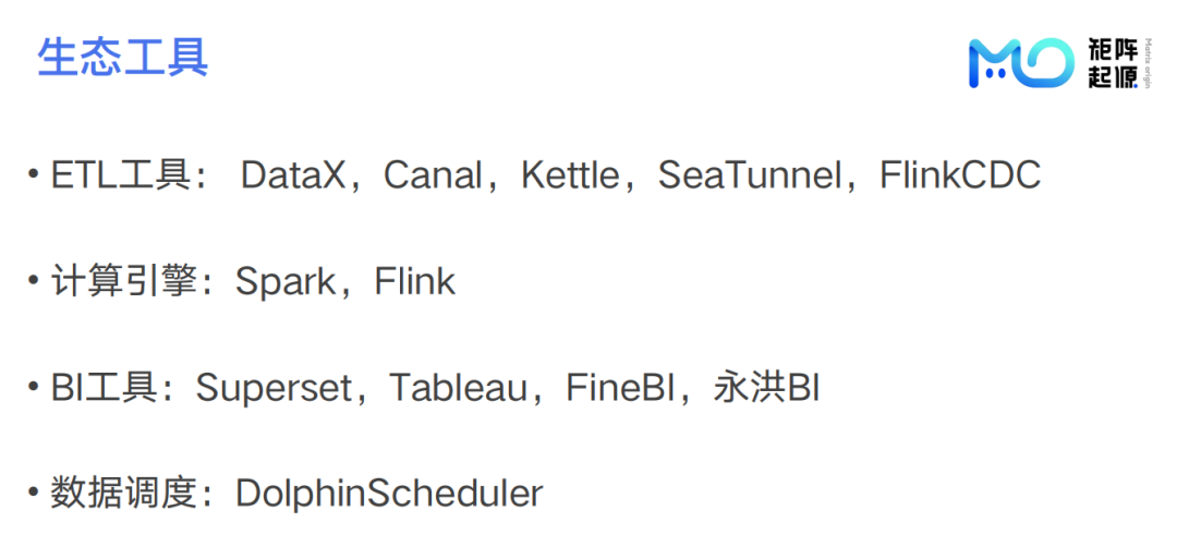 在面向大数据领域开发时,会用到很多如 ETL 工具、计算引擎、BI 工具和数据调度等工具。为确保兼容性,我们已经对这些工具进行了适配,并在官方网站上提供了相关教程文档。