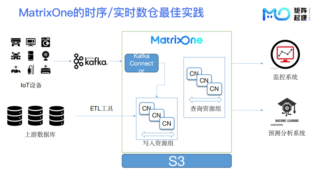 在 MatrixOne 中,我们同时关注时序和实时数据分析的场景。这两者虽然在侧重写入和查询方面有所不同,但整体架构相似。时序数据主要来源于 IOT 设备或监控系统,通过 Kafka 或其他消息队列写入数据库。另一方面,上游数据库(如 MySQL 或 TB 数据库)通过 ETL 过程将数据导入数据库。