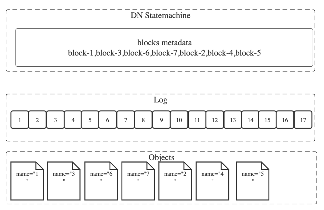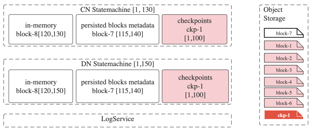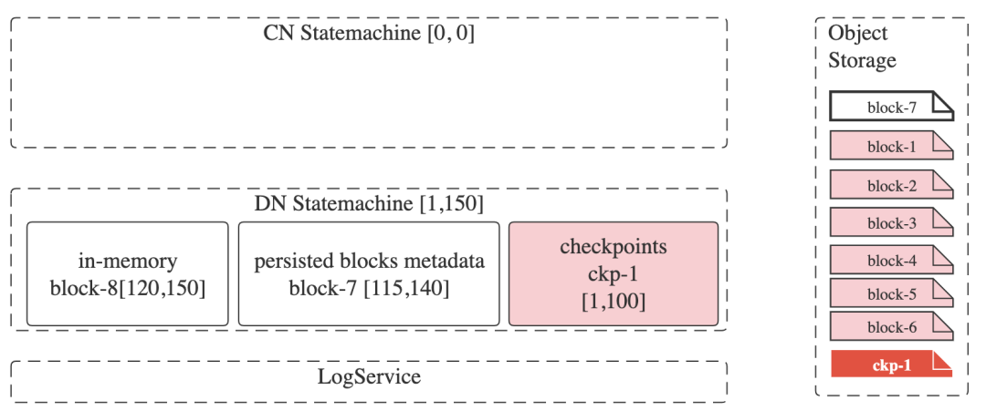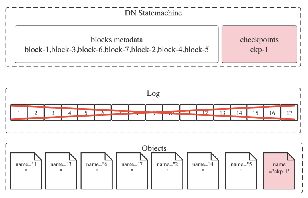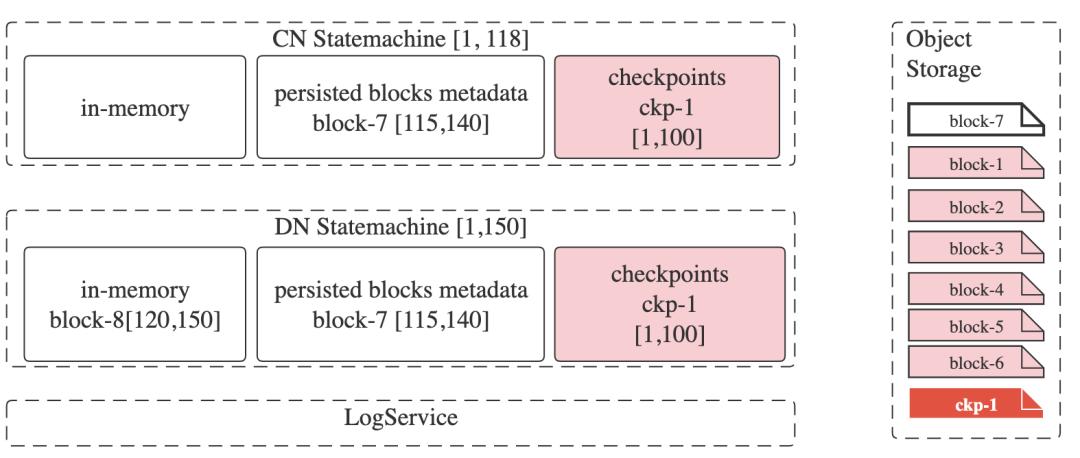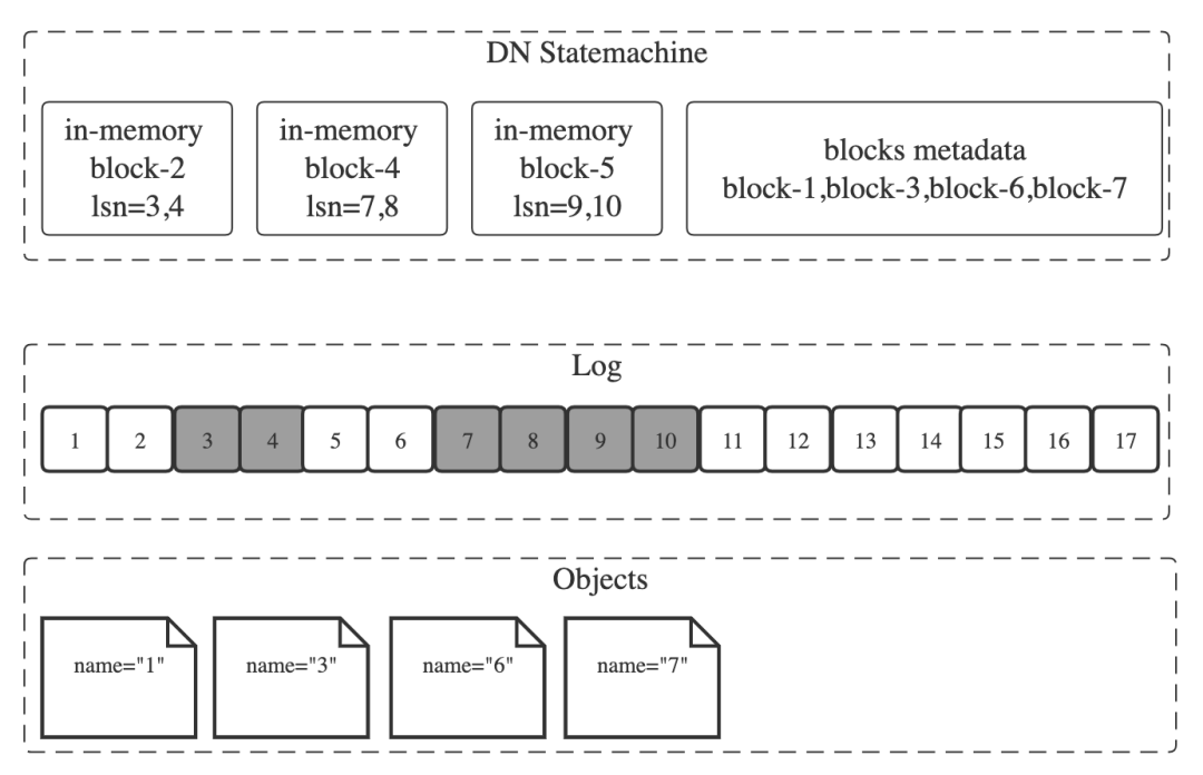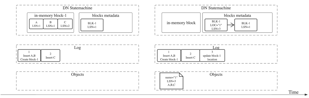 Part 3 DN(Data Node) 在写流程中,TAE会将提交事务写入日志,并且异步的转存至对象存储。这些都发生在DN(Data Node)结点。 第一个事务添加元数据Block-1, 并且插入A、B两行至Block-1。事务提交的日志是LSN=1; 第二个事务插入一行C至Block-1。事务提交日志是LSN=2; 第三个事务将Block-1持久化至对象存储上,修改Block-1元数据添加location=“1”, 产生该Block的第二个版本。事务提交日志是LSN=3。 DN状态机致力于将日志里的数据转存到对象存储上,但是转存顺序不完全依赖事务日志的单调性,如下图: LSN[11-17]的已经转存,但是LSN[3-4,7-10]还在内存状态机内(原因已在单机TAE的文章中解释)。这只是一个临时状态,DN会根据特定的策略推动日志的窗口不断向前移动。 DN会在适当的时机选择一个事务作为快照候选点,并等待这个候选点之前的所有事务被转存后,以这个候选点的时间戳作为快照的时间戳保存成快照。当快照生成后,该事务之前所有的日志都可以被清理: 这里我们将快照后所有的日志称为LogTail。比如上图中“ckp-1” 没有生成前,LSN[1-17]都是LogTail。DN出现故障后,只需要从对象存储上读取最新的快照,并且从日志服务中读取LogTail,便可恢复出完整的状态机。