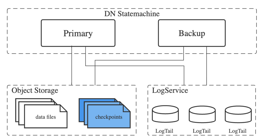 Part 4 CN(Compute Node) 分布式TAE不仅包括DN, 也包括负责协调所有查询负载的CN(Compute Node)。当集群加入一个新的CN, 它会从DN获取快照和LogTail信息,并且维护一个内存状态机。数据文件会按需从对象存储中拉取,并根据需要保存在缓存中。这种设计不需要在查询之前就拉取大量的数据文件,满足了高弹性CN的需求。 >>>举例说明 加入一个CN到集群,此时DN的状态可以按照事务时间戳描述为[1,150],表示拥有从时间戳1到150之间所有事务的数据。 DN的状态由以下三部分组成: 快照 [0,100],该快照包含6个数据块 [“block-1”, “block-2”, “block-3”, “block-4”, “block-5”, “block-6”] 持久化的数据块 “block-7“ [115, 140] 内存数据块 “block-8” [120, 150] CN接收到查询请求,假设该请求的时间戳为118: CN检查当前状态机的状态为[0, 0], 最大时间戳小于118; CN会向DN 发出一条读请求,请求0到118之间的LogTail; CN收到DN的响应,将LogTail应用到本地的状态机; 更新CN状态机的状态为 [1, 118]; 开始查询。 CN检查当前状态机的状态为[1, 118], 最大时间戳小于130; CN会向DN发出一条读请求,请求118到130之间的LogTail; CN收到DN的响应,将LogTail应用到本地的状态机; 更新CN状态机的状态为[1, 130]; 开始查询。