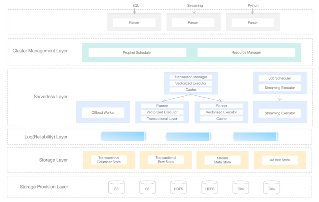 矩阵起源Global CTO田丰指出,实现一个HSTAP有两方面的挑战,一是架构方面的取舍。使用一款开源和成熟的数据库来扩展,会比较稳定而且容易快速推出产品,但有非常沉重的历史包袱,无法应对未来新型应用和基础设施的需要,因此MO(MatrixOne缩写)决定自己从头开始研发。 二是如何实现不同负载的资源隔离以及高效的资源分配。在这一点上,MO创新性的提出了储存、计算和事务分层解耦的架构,使得资源分配可以随着各种负载的变化高效分配,并可以做到单种负载的独立扩展。