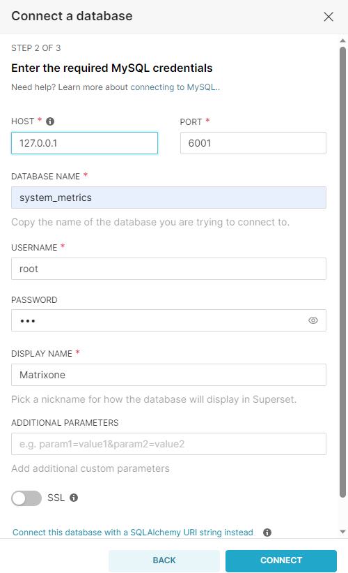 填写 MatrixOne 数据库的连接信息,包括主机、端口、用户名和密码。