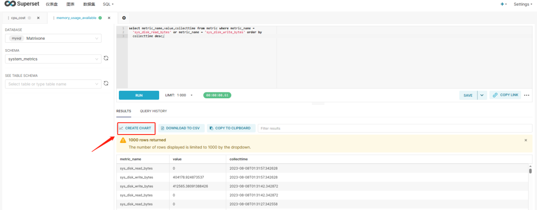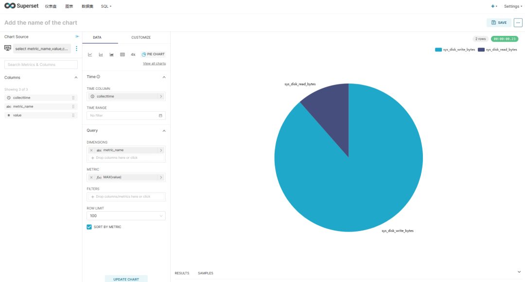 5. 编辑图表:这里我们用其中一个查询为例,来演示如何编辑一个可视化的图表。首先,我们选择 disk_read_write 的查询作为图表的制作数据源,在 SQL Lab 中对应查询的下面点击 CREATE CHART 或者在上一步保存完 Query 之后,页面将跳转至编辑 Chart 页面: