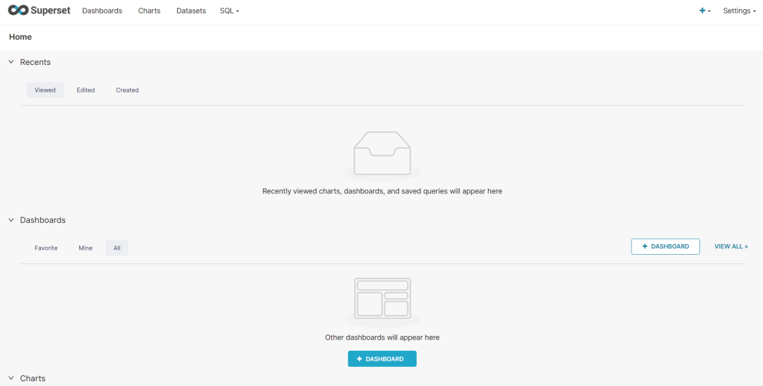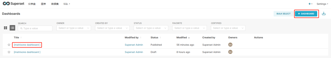 1. 创建了多个图表后,您可以在 Superset 中组装它们以创建一个监控仪表板:点击 Dashboards,然后点击 + DASHBOARD 来创建新的仪表板,或者编辑现有的仪表板。