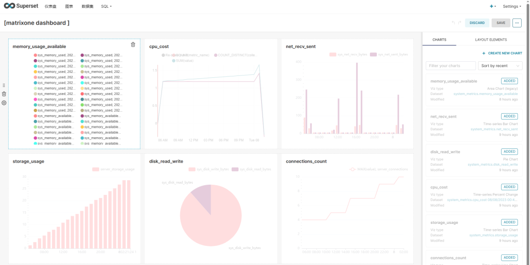 您已经成功地连接了 MatrixOne 数据库与 Superset,创建了一个简单的监控仪表板,以可视化展示 MatrixOne 数据库的重要指标。