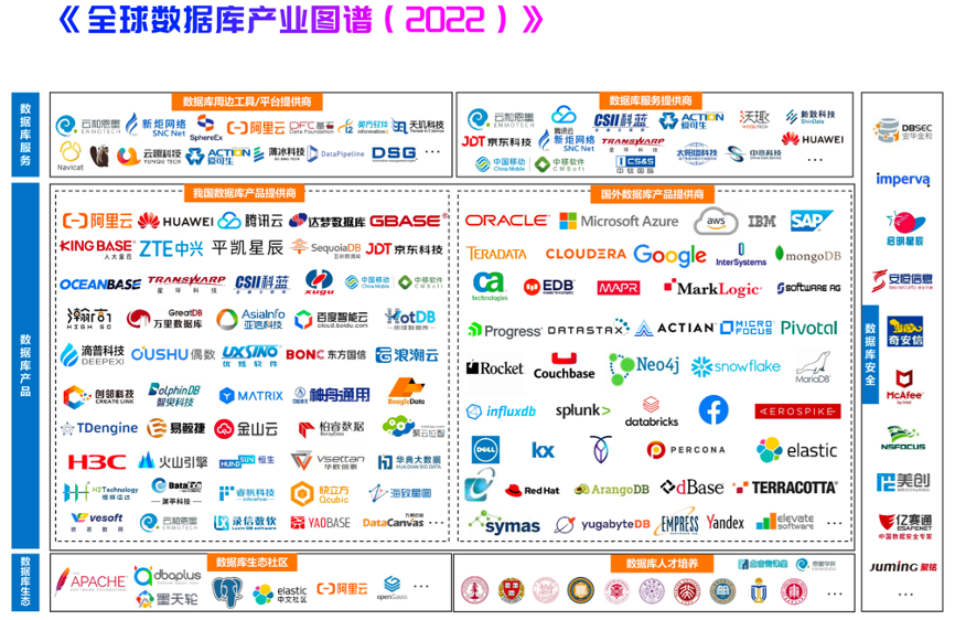 1 全球数据库产业图谱(2022) ▶ 我国数据库产业高速发展,中国信通院发布《全球数据库产业图谱(2022)》 7月8日, 中国信通院以及相关机构发布了《数据库发展研究报告(2022年)》、《全球数据库产业图谱(2022)》。会上,中国通信标准化协会副理事长兼秘书长代晓慧指出,我国数据库产业高速发展,完成了从跟跑到并跑的转变。 据悉,《数据库发展研究报告(2022年)》的编制工作,由阿里云、腾讯云、华为云、新炬网络等二十余家单位共同献力。《全球数据库产业图谱(2022)》收录了150余家企业、高校和社区等组织,分别收录于数据库产品、数据库服务、数据库生态和数据库安全四大领域中。 关注公众号,后台回复:图谱,即可获取《全球数据库产业图谱(2022)》高清版。 [来源:https://view.inews.qq.com/a/20220711A04MEV00]