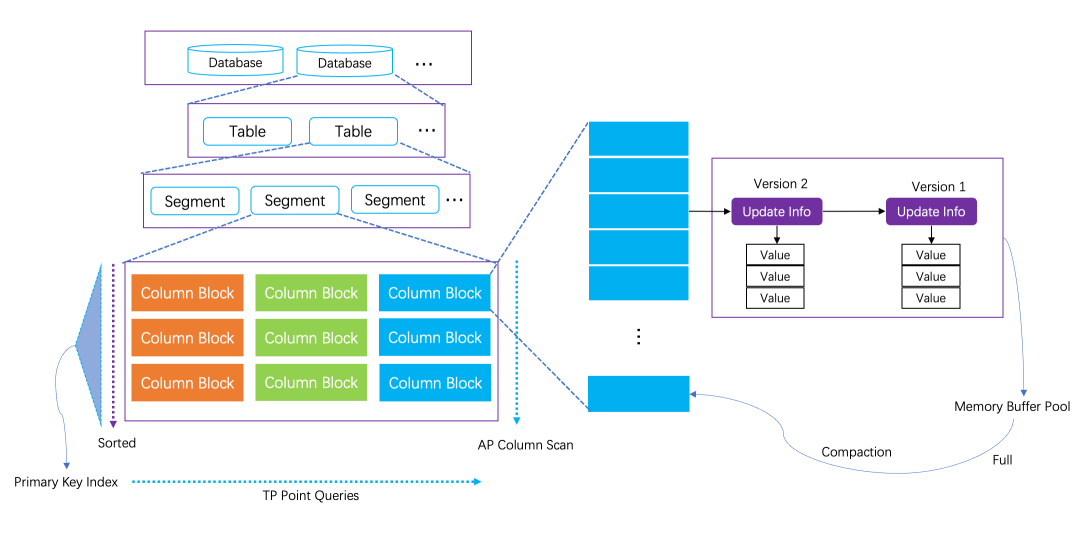 过去,MatrixOne只支持OLAP的AOE存储引擎。在本次迭代中,MatrixOne升级为完整支持HTAP的TAE存储引擎,可以通过单一引擎及一份存储同时实现OLAP及OLTP。TAE存储引擎基于列存,支持完整的ACID事务,并且提供了基于MVCC的Snapshot Isolation级别的事务隔离能力。