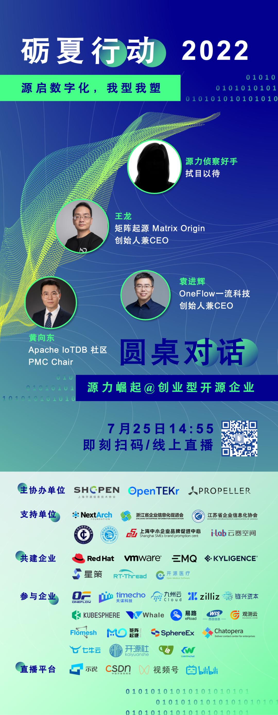 01 活动详情 📅日期:2022年7月25日 🕙时间:2:55-3:55PM 🙌圆桌论坛2:开源先进力 👨💻嘉宾: 明 爱 (源启数字化促进中心主理人) 王 龙 (Matrix Origin创始人兼CEO) 袁进辉 (OneFlow创始人兼CEO) 黄向东(Timecho创始人兼CEO) 02 活动报名 >扫码报名参加活动< 03 活动组织 - 主办单位 - 上海开源信息技术协会 - 协办单位 - 源启数字化促进中心、OpenTEKr - 支持单位 - NextArch 基金会、 长三角首席信息官联盟、 浙江省企业信息化协会、 江苏省企业信息化协会、 安徽省首席信息官协会、 上海中小企业品牌促进中心、 云赛空间 - 共建企业/组织 - VMware中国研发中心、 红帽Red Hat、星策社区、 EMQ、Kyligence、 武汉新致医卫、RT-Thread ... ... (持续更新ing) -参与企业/组织- Matrix Origin矩阵起源、 OneFlow、天谋科技、 青云KubeSphere、 SphereEx、StreamNative、 Zilliz、白鲸开源、九州云、 西信、易路、七牛云、 观测云、Flomesh、第四范式、 Gitea、Chatopera、LinkWeChat、 链兴资本、雅各布专栏 ... ... (持续更新ing) 04 活动海报 /// 关于 MatrixOne/// 作为新一代超融合异构云原生数据库MatrixOne。MatrixOne借助于全新设计和研发的统一分布式计算和存储框架,能够使用一套数据库系统同时灵活支持事物、分析和流计算的数据管理和应用。同时,得益于这一创新的架构设计,用户可以在公有云、私有云、数据中心和边缘节点上部署和使用MatrixOne。 秉承“One Size Fits Most”的产品理念,MatrixOne将运维工作简化到极致,使得数据应用开发变得极为简捷,同时也保证了数据处理的极致性能。
