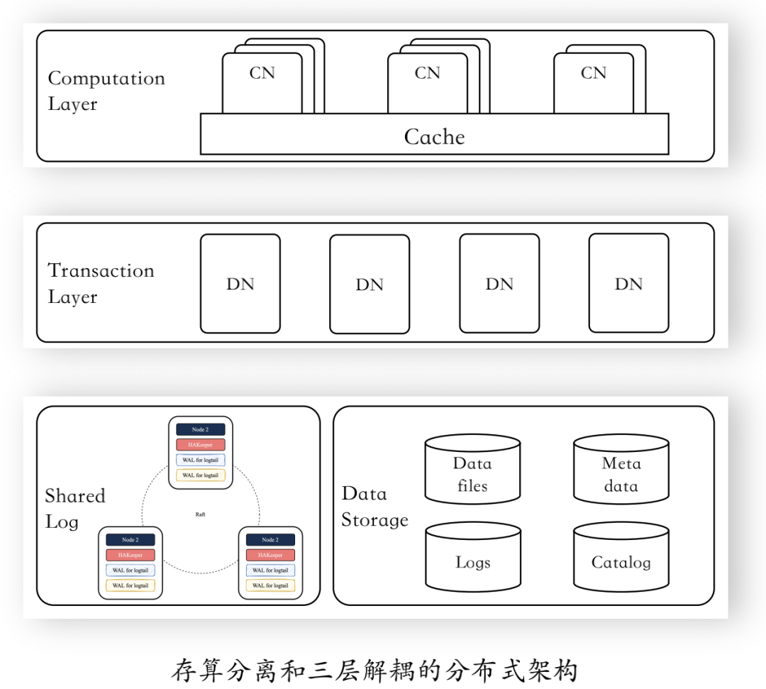 基于这样的设计理念,MatrixOne 引擎的顶层设计架构,可以大致分为三层:计算层、分布式事务层和共享存储层。