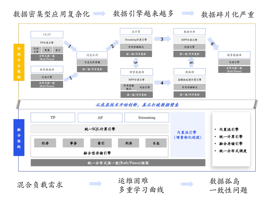 拿一个典型的融合型场景为例,一款股票 APP 本身是交易系统,所以它需要一个 OLTP 数据库做支撑,但是用户又希望其提供股市的预测和分析,这里自然就出现了对 OLAP 系统的需求,即在做大规模交易的同时,还需要基于交易数据和用户行为数据进行分析建模。