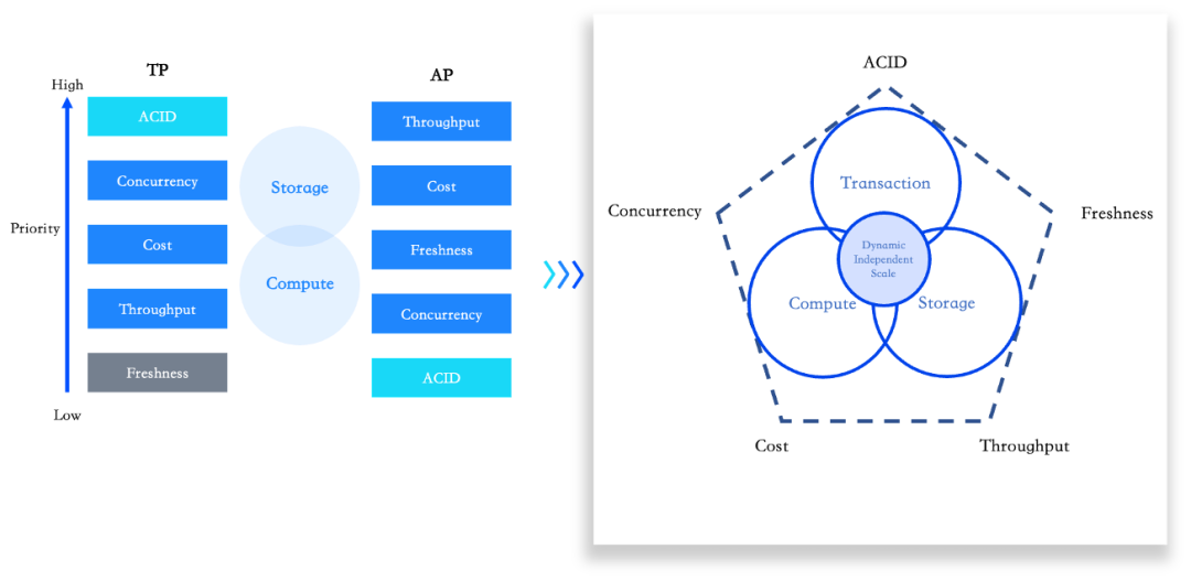 具体来说,用户对于 TP 和 AP 数据库系统的需求基本可以归纳为以下五点:ACID,并发性能,吞吐,成本和数据新鲜度。HSTAP 数据库若想兼容以上能力,实现起来却没那么容易,由于高并发、短时延的 OLTP 负载与带宽密集型、高时延的 OLAP 负载的访问模式不同且它们互相干扰,把他们融合到一个系统里存在很多的冲突点。