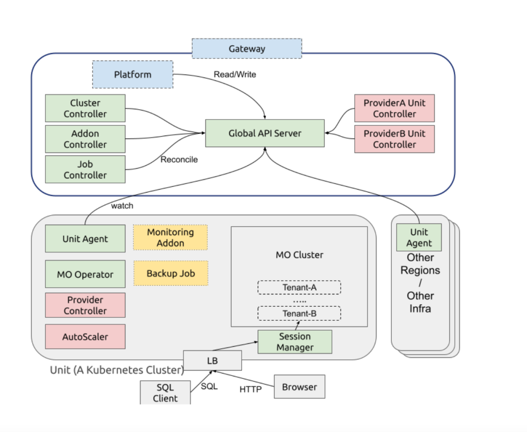 实际上,上述所提到的 MO-Operator 只是 MOCloud 的冰山一角,下图展示了 MOCloud 的架构图,包含平台(Platform)和编排( COS) 两套系统以及旁路观测系统。架构图的上半部分是 MOCloud 的控制面,Platform 包含了一组微服务,比如用户管理,集群管理,计费等,是整个 MOCloud 中唯一需要跟用户进行交互的部分,中间的 Global API Server 是 COS 的核心,也是 Platform 跟 COS 之间的纽带,架构图的下半部分是 MOCloud 的数据面,也就是真正运行工作负载的地方。