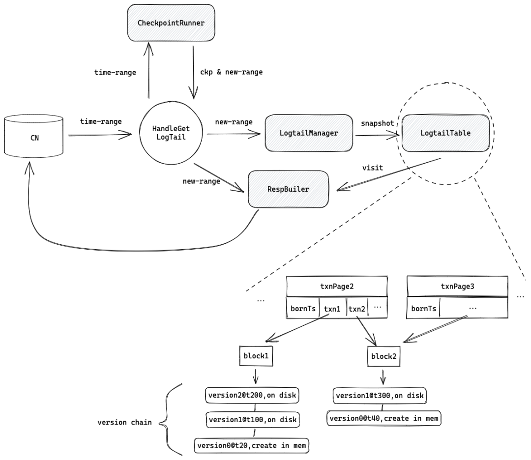 Part 2 Logtail 的产生 如前所述,可以通过 pull 和 push 两种方式进行 logtail 获取。这两种模式的特点不同,接下来分别介绍。 1. Pull 如前所述,pull 实际上是同步表的快照,以及后续产生的增量日志信息。 为了达成这个目的,TN 维护了一个按照事务 prepare 时间排序的 txn handle 列表,logtail table,给定任意时刻,通过二分查找得到范围内的 txn handle,再由 txn handle 得到该事务在哪些 block 上做过更新,通过遍历这些 block,就能得到完整的日志。为了加快查找速度,对 txn handle 做了分页,一个页的 bornTs 就是当前页中的 txn handle 的最小 prepare 时间,第一层二分的对象就是这些页。 基于 logtail table,从接收到 pull 请求,主要工作路径如下: 根据已有的 checkpoints,调整请求的时间范围,更早的可以通过 checkpoint 给出。 取 logtail table 的一份快照,基于访问者模式用 RespBuilder 去迭代这份快照中相关的 txn handle,收集已提交的日志信息。 将收集到的日志信息,按照 logtail 协议格式转换,作为响应返回给 CN。 这个过程依然有非常多的优化可以做,这里举几个例子: 如果请求的时间范围不是最新,在请求范围右侧范围内发生了数据刷盘,那么请求范围内的数据更改应该怎么给呢?我们认为再从对象存储中读出这个区间的更改是不必要的,直接把 block 元数据给到 CN,在 CN 利用时间戳过滤去指定范围的数据是更节省的做法。 如果一个时间范围内的内存更改是在太多,通过内存发送也是不实际的,所以会在收集时检查响应大小,如果过大,可以强制刷盘,重新收集。 Logtail table 也需要根据 checkpoint 做定时清理,避免内存膨胀。另外也对更早的 txn handle 可以做一些数据上的聚合,避免每次都从 txn handle 层面迭代 2. Push Push 的主要目的是更实时地 TN 同步增量日志到 CN。整体流程分为订阅、收集、推送三个阶段。 订阅:一个新 CN 启动后的必要流程,就是作为客户端,和服务端 TN 建立一个 RPC stream,并且订阅 catalog 相关表,当 database、table、column 这些基本信息同步完成后,CN 才能对外提供服务。当 TN 收到订阅一个表的请求时,其实先走一遍 pull 流程,会把 截止到上次 push 时间戳前 的所有 logtail 都包含在订阅响应中。目前对一个 CN,logtail 的订阅、取消订阅、数据发送,都发生在一条 RPC stream 链接上,如果它有任何异常,CN 会进入重连流程,直到恢复。一旦订阅成功,后续的 logtail 就是推送增量日志。 收集:在 TN,一个事务完成 WAL 写入后,触发回调执行,在当前事务中收集 logtail。主要流程是遍历 workspace 中的 TxnEntry(一种事务更新的基本容器,直接参与到 commit pipeline 中),依据其类型,取对应的日志信息转换为 logtail 协议的数据格式。这个收集过程通过 pipeline,和 WAL 的 fysnc 并发执行,减少阻塞。 推送:推送阶段主要做一次过滤,如果发现某个 CN 没有订阅该表,就跳过该 CN,避免推送。 按事务收集有一个比较明显的问题,如果一个表长时间没有更新怎么办?CN 怎么知道是没有更新,还是没有收到呢?这里就加入了心跳机制,默认是 2 ms,TN 的 commit 队列中会放入一个 heartbeat 的空事务,不做任何实质性工作,只消耗时间戳,从而触发一次心跳 logtail 发送,告知 CN 此前的所有表数据已经发送过更新,推动 CN 侧的时间戳水位更新。