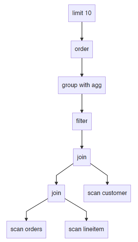 selectl_orderkey,sum(l_extendedprice * (1 - l_discount)) as revenue,o_orderdate,o_shippriorityfromcustomer,orders,lineitemwherec_mktsegment = \'HOUSEHOLD\'and c_custkey = o_custkeyand l_orderkey = o_orderkeyand o_orderdate < date \'1995-03-29\'and l_shipdate > date \'1995-03-29\'group byl_orderkey,o_orderdate,o_shippriorityorder byrevenue desc,o_orderdatelimit 10