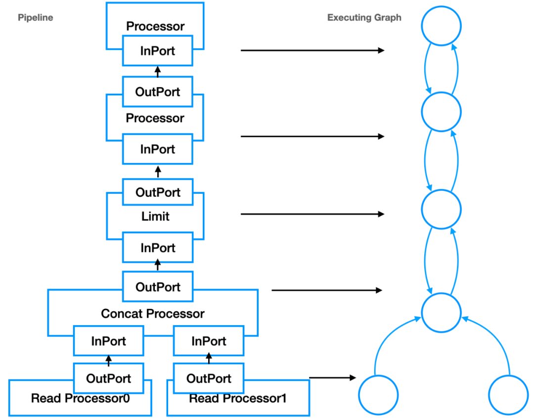 pull调用的时候从thread_group选择线程,然后data.executor->execute(num_threads)执行PipelineExecutor,num_threads表示并行线程数。接下来PipelineExecutor将Pipeline转化为执行图ExecutingGraph。Pipeline是逻辑结构,并不关心如何执行,ExecutingGraph则是物理调度执行的参照。ExecutingGraph通过Pipeline Operator的InputPort和OutputPort转换为Edge,用Edge把2个Operator连接起来,Operator就是图的Node。随后就是PipelineExecutor::execute通过ExecutingGraph对Pipeline调度,这个函数主要作用是通过task_queue中pop出执行计划的ExecutingGraph::Node来调度任务。调度时,线程会不停遍历ExecutingGraph,根据Operator的执行状态进行调度执行,直到所有的Operator都到达`Finished`状态。调度器初始化,是挑选ExecutingGraph中所有没有OutPort的Node启动的,因此,控制流是从Pipeline的Sink Node发出的,递归调用prepareProcessor,这区别于Push模型的控制流从Source Node开始逐级向上。除了控制流向的不同,这个Pipeline Operator跟Push完全一样,因此也有人将ClickHouse归入Push模型中,毕竟,在很多文献的上下文,Push等同于Pipeline Operator,Pull等同于火山。Pipeline和ExecutingGraph的对应如图所示(在ClickHouse中,Operator=Processor=Transformer):