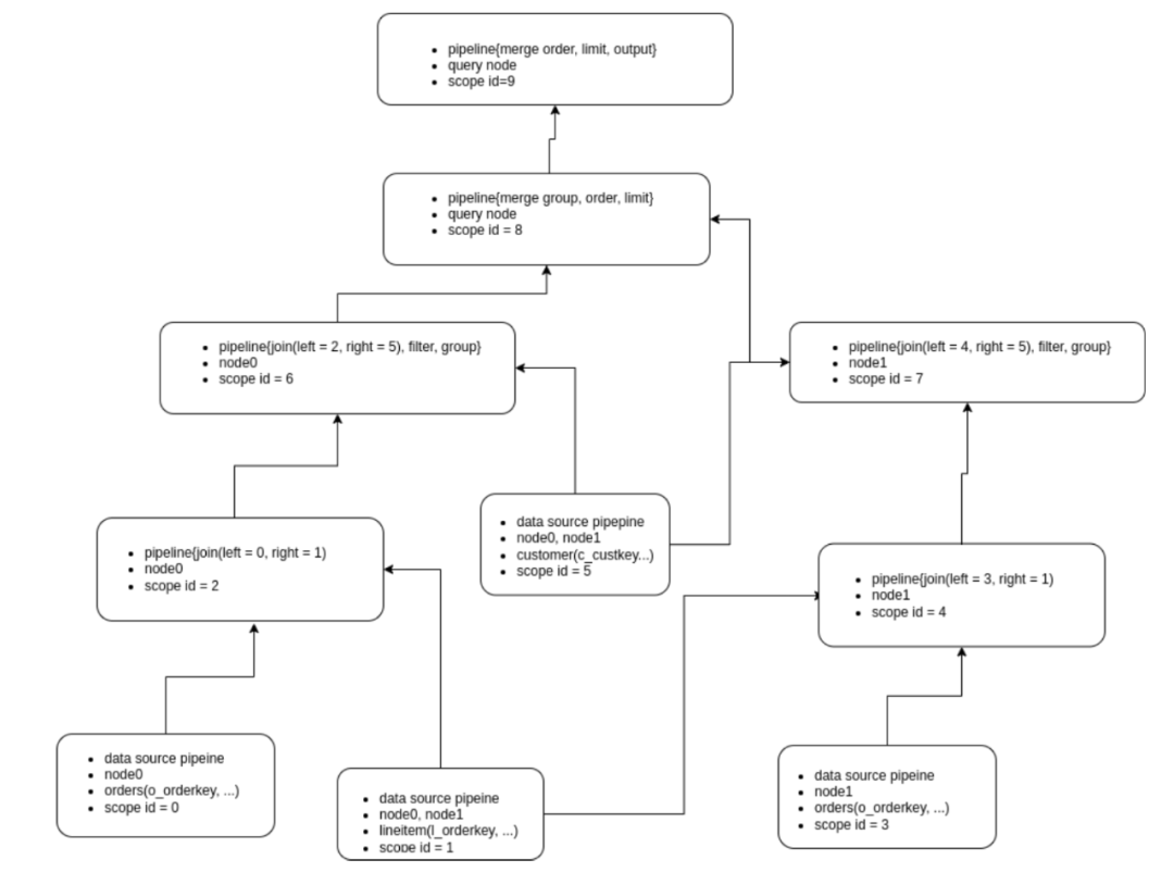 假设三张表的数据均匀分布在两个节点node0和node1上,那么对应的Pipeline如下: