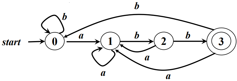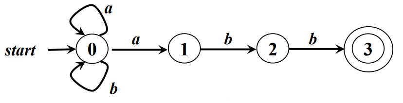 实现正则匹配,可以通过 FA ,举个例子,比如我们要识别正则文法 r = (a | b) * abb,状态转换图如下: