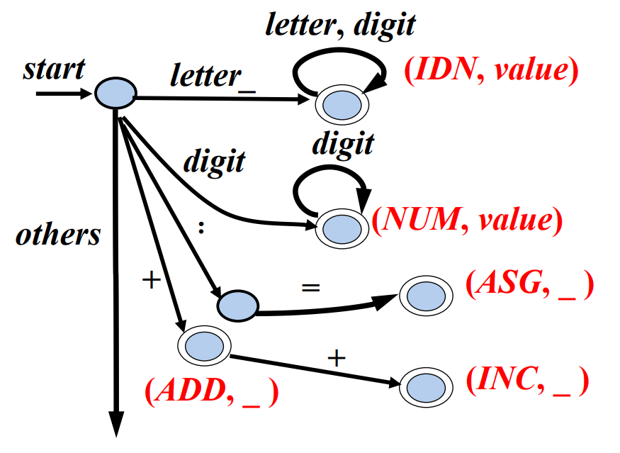 这样,通过对不同类型的token作出状态图,再将其整合,一个简单识别token DFA如下: