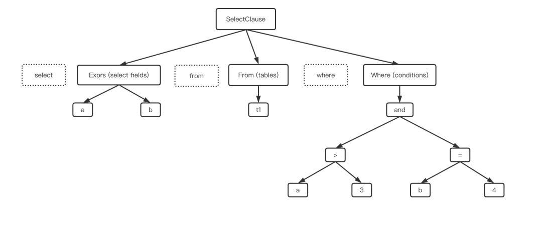 Part 4 MatrixOne Parser MatrixOne Parser(以下简称“MO Parser”)的词法分析是手动编写的,主要的作用就是分词,为语法分析器提供token。数据库语法分析其实就是生成语法树的过程,也是整个SQL解析的重点。mysql_sql.y中定义了MO的语法规则,规则文件的结构如下: 在select.go中可以看到简单的select的部分定义 SelectClause: 当成功解析完 SQL,MO定义的结构体里的字段都会被相应赋值。比如,解析 SQL: 会生成如下语法树:%{// 在这里可以引入包名,在解析的过程中就可以调用到相应的函数}%%struct { id int // token id str string // token 字符串 item interface{} // 将 token 转化为实际的类型,比如 1 会转化成 int64 类型}%union {// 在这里定义 mo 设计好的语法树结构,比如 selectStatement tree.SelectStatement}// 这里定义一系列的终结符,即 token。goyacc 会生成对应的 token id,比如%token<str> SELECT// 接着定义一系列非终结符。可以用 %union 中的字段来定义,goyacc 会做相应的映射,比如%type <selectStatement> simple_select_clause%%// 在这编写 BNF,为了兼容 MySQL 语法,语法规则会参考 MySQL,当然,也会有 MatrixOne 自己的一些语法// 比如 simple_select_clause 的一部分定义simple_select_clause: SELECT distinct_opt select_expression_list from_opt where_expression_opt group_by_opt having_opt { $$ = &tree.SelectClause{ Distinct: $2, Exprs: $3, From: $4, Where: $5, GroupBy: $6, Having: $7, } }%%type SelectClause struct { SelectStatement Distinct bool Exprs SelectExprs From *From Where *Where GroupBy GroupBy Having *Where Option string}select a, b from t1 where a > 3 and b = 4;