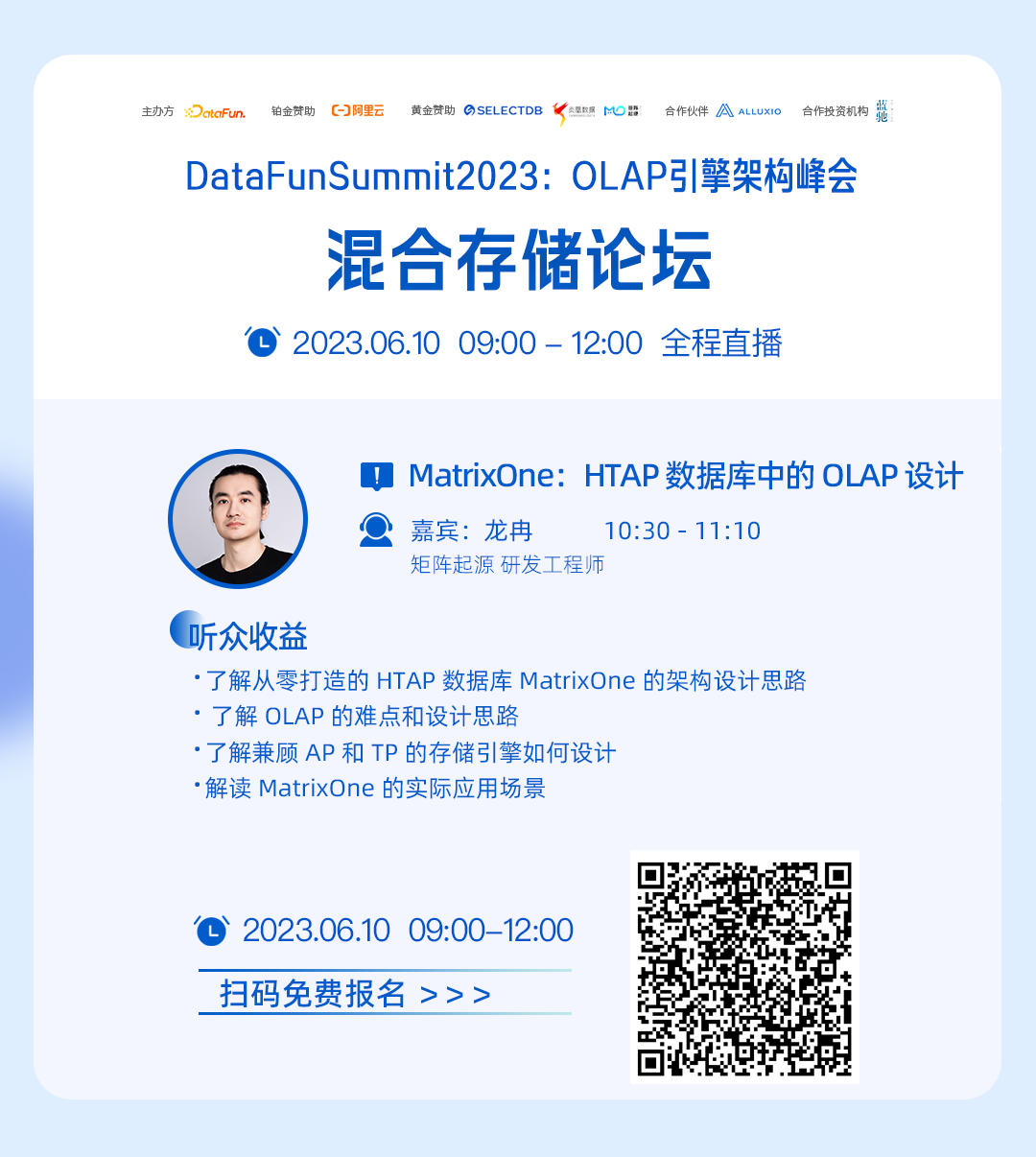 演讲主题 MatrixOne:HTAP 数据库中的 OLAP 设计 演讲提纲 MatrixOne 整体架构介绍 MatrixOne OLAP 的设计细节 MatrixOne 如何隔离AP和TP MatrixOne 的实践应用场景 听众收益 了解从零打造的HTAP数据库MatrixOne的架构设计思路 了解OLAP的难点和设计思路 了解兼顾AP和TP的存储引擎如何设计 解读MatrixOne的实际应用场景 专场信息 日期:2023年6月10日 时间:10:30 – 11:10 专场:混合存储论坛 >>> 扫码预约在线直播 <<< 混合存储论坛专场 DataFunSummit2023:OLAP引擎架构峰会 随着大数据存储时代的到来,大家对于大容量、高性能和低成本的存储系统的需求愈发迫切。混合存储充分利用不同类型存储器件的特性组成高效的存储系统,既能支持存储系统容量的大幅扩展,又能在保证系统低成本的前提下,显著提高存储系统的性能。于此同时,将混合存储系统中的数据进行统一管理,形成数据编排层,并通过缓存策略来加速数据被上层计算所使用,正逐渐在企业的大数据分析和AI场景中广泛应用。此次会议中,我们将为大家带来混合存储和数据编排最新技术发展、产品方案,及两者相结合的用户案例分享。