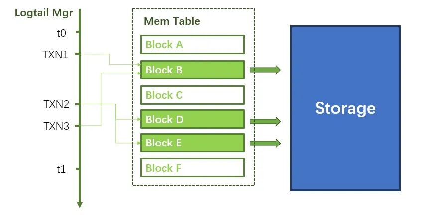 Part 2 Checkpoint Checkpoint将脏数据写入Storage,销毁旧的log entry,释放空间。MatrixOne中,checkpoint是一个后台发起的任务,它的流程是: 选定一个合适的时间戳作为checkpoint,然后扫描时间戳之前的修改。图上的t0是上个checkpoint,t1是当前选定的checkpoint。[t0,t1]之间发生的更改需要转存。 转存DML修改。DML更改存在memtable中的各个block中。Logtail Mgr是一个内存模块,记录着每个事务改动了哪些block。在Logtail Mgr上扫描[t0,t1]之间的事务,发起后台事务把这些block转存到Storage上,在元数据中记录地址。这样,所有t1前提交的DML更改都能通过元数据中的地址查到。为了及时做checkpoint,不让WAL无限增长,哪怕区间中block只改动了一行,也需要转存。 扫描Catalog转存DDL和元数据更改。Catalog是一棵树,记录了所有的DDL和元数据信息,树上的每个节点都会记录更改发生的时间戳。扫描时收集所有落在[t0,t1]之间的更改。 销毁旧的WAL entry。Logtail Mgr中存了每个事务对应的LSN。根据时间戳,找到t1前最后一个事务,然后通知Log Backend清理这个事务的LSN之前的所有日志。