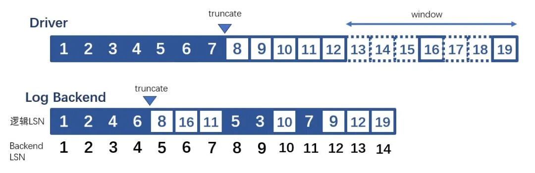 Part 5 处理Log Backend的乱序LSN 为了加速,向Log Backend并发写入entry,写入成功的顺序和发出请求的顺序不一致,导致Log Backend中产生的LSN和上层传给Driver的逻辑LSN不一致。Truncate和重启的时候要处理这些乱序LSN。为了保证Log Backend中的LSN基本有序,乱序的跨度不要太大,维持了一个逻辑LSN的窗口,如果有很早的log entry正在写入还未成功,会停止向Log Backend写入新的entry。例如,如果窗口的长度是7,图中的LSN为13的entry还未返回,就会阻塞住LSN大于等于20的entry。 Log Backend中通过truncate操作销毁日志,销毁指定LSN之前的所有entry。这个LSN之前的entry所对应的逻辑LSN都要小于逻辑truncate点。比如图中逻辑truncate到7,这条entry对应Log Backend中的11,但是Log Backend中5,6,7,10对应的逻辑LSN都大于7,不能被truncate。Log Backend只能truncate 4。 重启时,会跳过开始和末尾那些不连续的entry。比如图上的Log Backend写到14时,整个机器断电了,重启时会根据上次的truncate信息过滤掉开头8,9,11。等读完所有的entry发现6,14的逻辑 LSN和其他的entry不连续,就丢弃末尾的6和14。