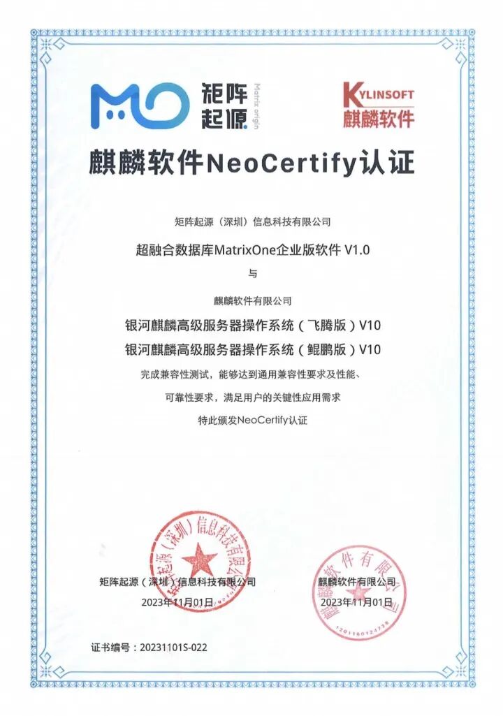 近日,矩阵起源超融合数据库MatrixOne企业版软件与麒麟软件银河麒麟高级服务器操作系统(飞腾版、鲲鹏版)V10 完成产品兼容性认证,并获得证书《麒麟软件NeoCertify认证》。