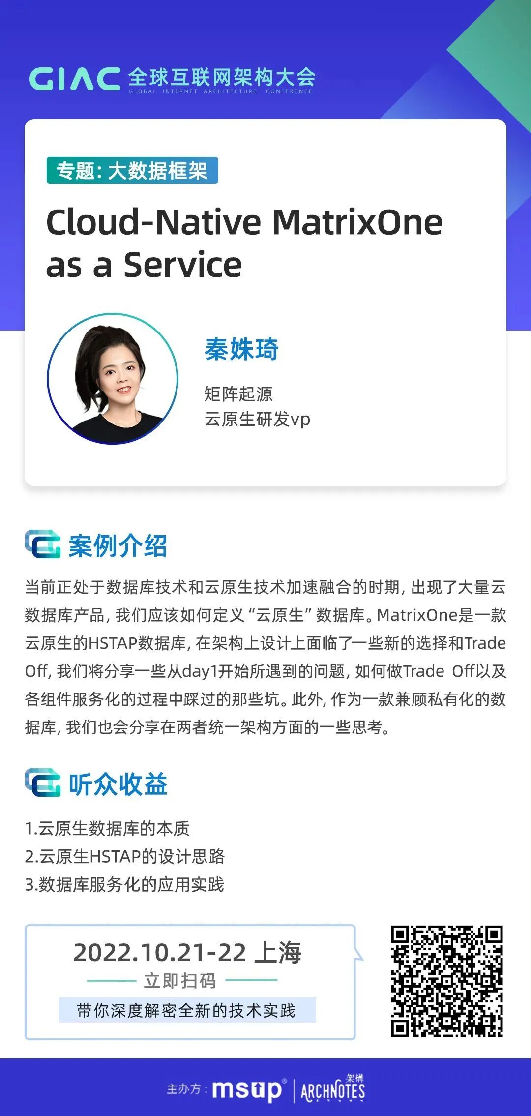 演讲主题 MatrixOne-云原生HSTAP数据库的技术实践 主题摘要 MatrixOne在cloud-native htap的架构设计上遇到的一些痛点和在各种节点服务化的过程中踩的坑,以及私有化和云原生两种场景的一些思考。 >>> 扫码报名 <<< 项目进度 MatrixOne&MO Cloud的Alpha版本将在下半年陆续发布。 您的收益 云原生数据库的本质 云原生HSTAP的设计思路 数据库服务化的应用实践 关于GIAC Global Internet Architecture Conference 全球互联网架构大会(简称“GIAC”)是长期关注互联网技术与架构的高可用架构技术社区和msup推出的面向架构师、技术负责人及高端技术从业人员的年度技术架构大会,是中国地区规模最大的技术会议之一。 当下,业务需求层出不穷、技术发展日新月异,因此,软件系统复杂度及系统共性和特殊性问题在很大程度上决定了软件开发的成败。那么,在软件设计之初如何进行高质量的架构设计,如何有效地支持日后的架构演化,变得越来越重要了。 作为一名合格的架构师,完备的技术领域知识是必备技能。2022年10月21-22日,由msup和高可用架构联合主办的2022GIAC全球互联网架构大会将在上海海神诺富特大酒店正式召开。本届大会,组委会携手了100余位来自阿里、百度、华为、快手、腾讯云等一线互联网资深架构师及技术型CTO为主的大咖讲师,进行深入的技术解读与探讨交流。大会涉及“安全与风控”、“元宇宙与Web3”、“开源生态”、“DevOps”、“云原生架构”等多个前沿且热门的技术领域。同时,通过2天、84+落地实践与前沿技术案例,可以为大家带来一场收获之旅。 本届大会日程现已上线,欢迎点击查看全部议题: