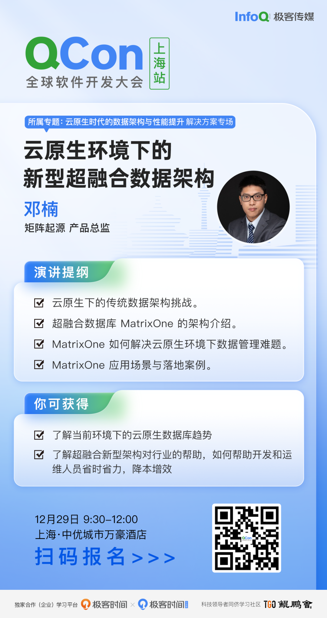 QCon 全球软件开发大会是由极客邦科技旗下 InfoQ 中国主办的综合性技术盛会,每年在伦敦、北京、纽约、圣保罗、上海、旧金山召开。自2007年3月份开始举办以来,已经有超万名有多年从业经验的技术人员参加过 QCon 大会。QCon 内容源于实践并面向社区,演讲嘉宾依据热点话题,面向5年以上工作经验的技术团队负责人、架构师、工程总监、开发人员分享技术创新和实践。