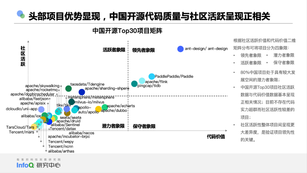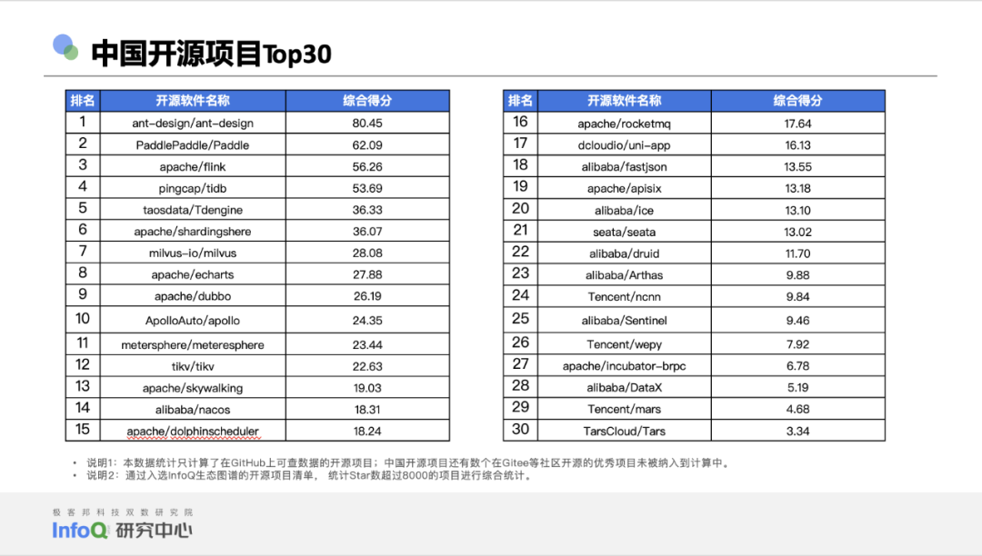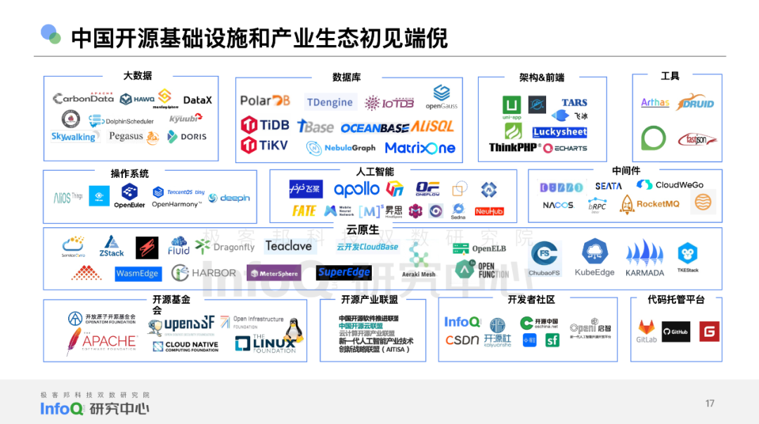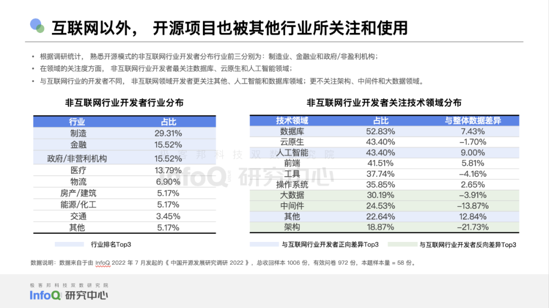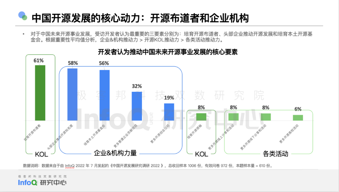 除了登录平台账号使用开源代码,为开源社区做文档、代码层面的贡献,我们究竟能有多了解开源?或者说,作为见证了中国开源崛起的一代开发者,我们还应该了解关于开源的哪些事儿? InfoQ 发布《中国开源发展研究分析 2022 》研究报告,为开发者,技术管理者,开源社区运营、市场,开源办公室工作人员以及其他对开源有一定基础认知,但期待进一步了解开源、理解开源的朋友,带来信息上的增量以及对开源趋势、开源人画像方面的关键洞察。 为了确保为报告读者带来最大价值,我们坚持中立原则——整份报告汇总并清洗了来自自有调研、GitHub 相关数据工具、行业其他调研等多方数据来源,综合权衡了来自 Apache 基金会、X-lab 开放实验室、腾讯开源联盟、CNCF 、开放原子开源基金会等组织的多方专家的意见,力求为你带来最贴近事实标准的、有可参考意义的报告内容。当然,无论是对一个行业的观察,还是对某一领域的评估模型,都要在实际采用中不断迭代,也欢迎你为 InfoQ 研究中心多提意见,联系方式见文末。 关于自有调研,是指由极客邦科技双数研究院 InfoQ 研究中心于 2022 年 7 月发起,面向中国技术人的的问卷调查。该问卷通过技术社区进行问卷回收;总问卷回收样本为 1006 份, 其中有效问卷 972 份,610 人拥有开源代码托管平台账号。我们欣喜的发现,问卷回收样本覆盖了我国 30 个省级行政区、 96 个城市,一些朋友即便远在乌鲁木齐,也一样细心地填写了调研问卷。感谢你们的时间和精力,这些真实反馈,是献给我们这个行业的最好礼物。 报告查看 / 下载链接:https://sourl.co/7Q7QcA 通过以上调研、访谈,以及必要的桌面研究,我们发现,关于开源项目,中国知名开源项目技术领域分布已经非常广泛,社区、企业、基金会的生态基本形成,技术领域正在从优势领域数据库向操作系统 & 人工智能和云原生等方向进行升级聚焦。 在被使用最广泛的话语体系里,所谓的非互联网行业一般和互联网行业有所区隔,我们发现,在非互联网行业中,对开源模式认知度最高的三大领域分别是制造、金融、政府 / 非营利机构。 而开发者(互联网 + 非互联网)整体关注的技术领域相对平均,排名前三的是数据库、云原生和工具;获得的关注度分别是 45.4%、45.1% 和 41.9%。基础软件领域是重要组成部分。非互联网领域的开发者关注度最高的是数据库、云原生和人工智能领域;分别为 52.83%、43.40%、43.4%; 如何对开源项目做出更加理性的洞察? 我们认为这不能听信于任何一个机构单方面的判断和标准,必须以场景需求为最终参考依据,建立在承认并充分理解事实的基础上,做出综合评判。因此,我们将开发者对于开源价值的认可体现为代码价值和社区活跃两个方面,并在可规模化获取的数据中选取 8 项指标作为模型依据, 对应赋值形成 InfoQ 开源项目指数模型。 通过模型, 我们计算出了社区活跃 Top 10 项目、代码价值 Top 10 项目和中国开源项目 Top 30。值得注意的是,中国 Top 级开源项目与国际顶级开源项目仍存在较大差异, 如果采用相同的算法, 国际 Top 10 项目的平均分是国内 Top 10 项目平均分的 4.78 倍,中国开源仍然任重而道远。 在本次参与调研的大部分开发者眼中,开源布道者和企业机构将是未来中国开源发展的重要砝码。开源将推动云原生、人工智能、操作系统等技术领域在中国的快速成长,开源的使用场景将从以互联网为和核心的行业分布向金融 + 工业的趋势推进,而国际化协同将进一步加深:来自出海和商业化的共同诉求,也将促进本土生态蓬勃发展。 为了最大限度保证报告质量,InfoQ 《中国开源发展研究分析 2022 》报告总长度为 70 页,更多精彩内容等待你在实际报告中发掘。 报告查看 / 下载链接:https://sourl.co/7Q7QcA 郭炜,Apache 基金会成员、Apache 孵化器导师、ClickHouse 华人社区创始人、 Apache Dolphin Scheduler PMC、Apache SeaTunnel(incubating) 导师,中国开源社区最佳 33 人,TGO 鲲鹏会(北京)分会负责人; 单致豪,腾讯开源联盟主席,Linux 基金会董事会观察员、TARS 基金会董事主席、Linux 基金会 Akraino 边缘计算 TSC 、开放原子开源基金会 TOC ,木兰开源社区 TOC ,NextArch 基金会 TOC,TGO 鲲鹏会(深圳)分会董事会成员; 王伟,华东师范大学数据科学与工程学院研究员,博士生导师。X-lab 开放实验室创始人,开源社副理事长,CCF 高级会员,CCF 开源发展委员会委员; 刘京娟,开放原子开源基金会副秘书长; 宋可为,北京开源创新委员会常务副主任秘书长,中国开源软件推进联盟副秘书长; 栗蔚,中国信通院云计算与大数据研究所副所长; 姜宁,Apache 基金会董事; 陈泽辉,CNCF 基金会中国区总监; 许勇,开放原子开源基金会 TOC 成员,腾讯技术委员会对外开源管理办公室执行总监; 黄东旭,PingCAP 联合创始人兼 CTO,CCF 数据库专委会委员,TGO 鲲鹏会学员; 陶建辉,TDengine 创始人、核心研发,TGO 鲲鹏会学员; 王龙,矩阵起源创始人,TGO 鲲鹏会学员; 张铎,开放原子开源基金会 TOC 成员,神策数据首席架构师; 赵生宇,X-lab 开放实验室核心成员;