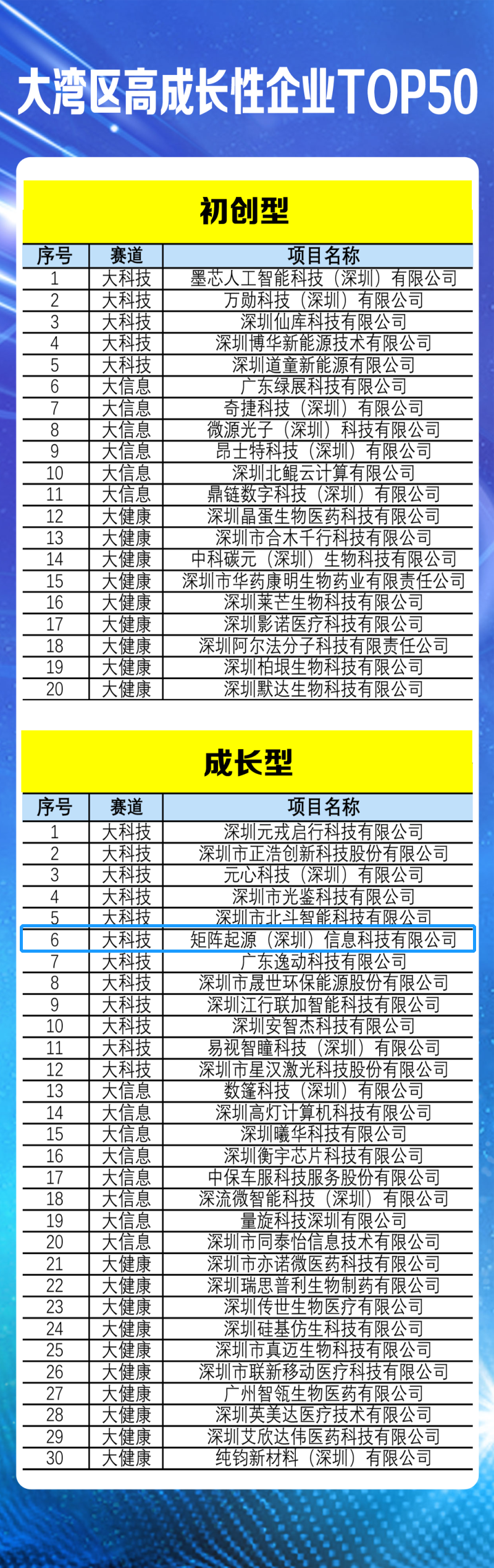 7月21日举行的石岩湖国际LP高峰论坛发布了《大湾区高成长性企业TOP50》榜单。上榜企业中有初创型20家、成长型30家,当中估值最高的企业“身价”达100亿元人民币。矩阵起源MatrixOrigin入选该榜单。