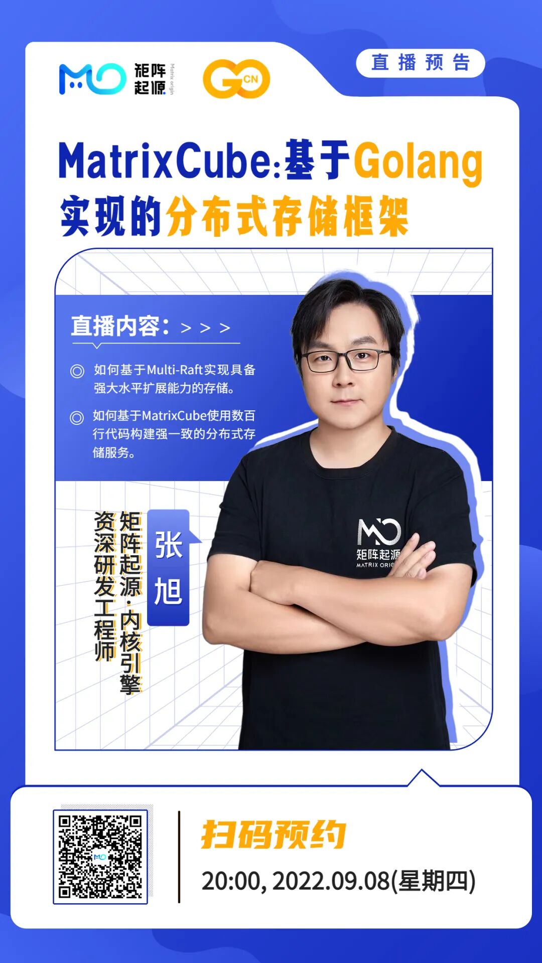 演讲主题 MatrixCube: 基于Golang实现的分布式存储框架 主题摘要 介绍如何基于Multi-Raft实现具备强大水平扩展能力的存储;分享如何基于MatrixCube使用数百行代码构建强一致的分布式存储服务。 直播时间 20:00, 2022.09.08(星期四) >>> 扫码预约 <<< 项目背景 MatrixCube在新一代分布式HTAP数据库 MatrixOne (0.4)中承担了分布式的核心功能。MatrixCube是一个复制状态机模型的Multi-Raft的架构,对底层数据存储做了抽象,可以对接任意单机存储引擎提供分布式的存储能力。 关于GoCN Go中国技术社区面向国内Go语言开发者,致力于搭建国内最具规模和生命力的Go开发者社区,目前GoCN技术社区目前整体用户量达10万+。