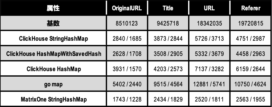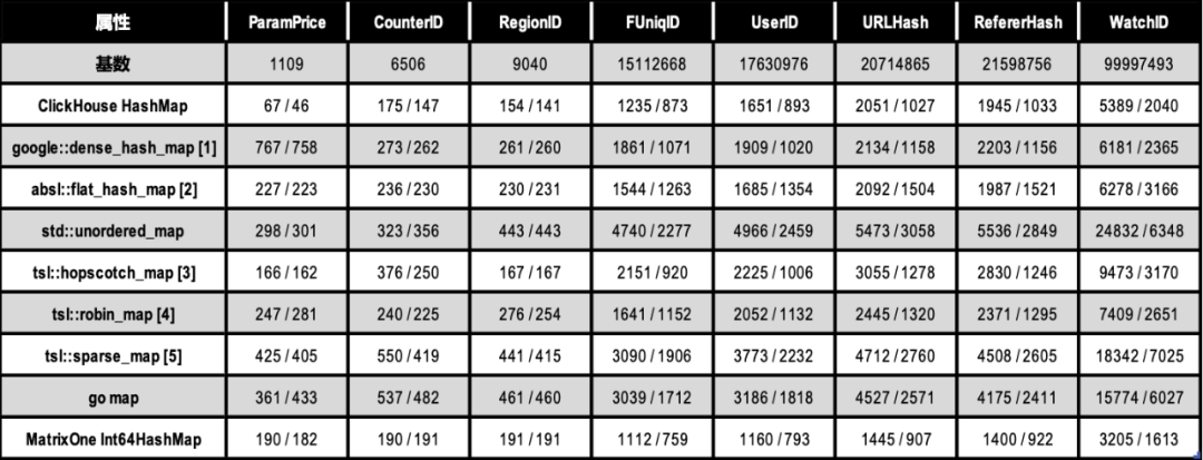 由此可见,哈希表对于数据库的SQL基础能力起着很关键的作用 ,本文讨论哈希表的基本设计与对性能的影响,比较各种常见哈希表实现,然后介绍我们为MatrixOne实现的哈希表的设计选择与工程优化,最后是性能测试结果。