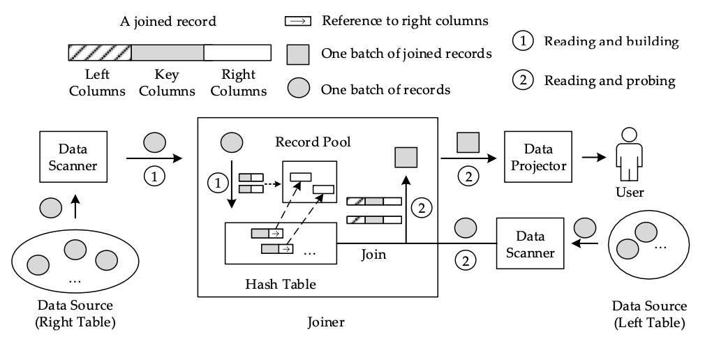 它同样也有两个阶段:第一阶段是使用Join语句右侧表的数据建立一个哈希表,第二阶段是从左侧表中读取数据,并快速探测刚刚建立的哈希表。构建阶段与上面的分组实现类似,但每个哈希表的槽位都存储了对右边列的引用。