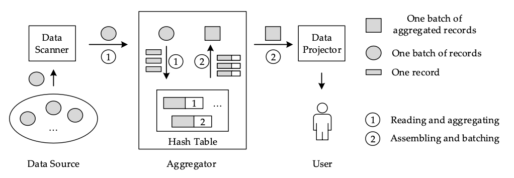它包含两个处理阶段:第1阶段是使用数据源的数据建立一个哈希表。哈希表中的每条记录都与一个计数器有关。如果记录是新插入的,相关的计数器被设置为1;否则,计数器被递增。第二阶段是将哈希表中的记录集合成一种可用于进一步查询处理的格式。